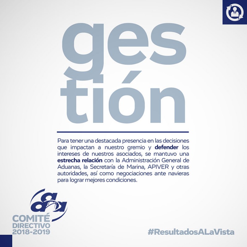 Como parte de los #ResultadosAlaVista nuestro Comité Directivo 2018-2019 realizó una constante representación de los intereses de nuestros agremiados ante las diversas autoridades federales, liderando las gestiones necesarias con la Administración General de Aduanas, SAT y APIVER, entre otras, además de efectuar un cabildeo permanente con diputados federales y senadores, a fin de que legislaran con equidad temas de importancia para el gremio aduanero.